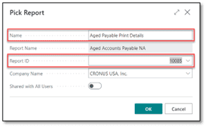 - Enter a name to identify the Report and the usage, for example, “Aged Payable Print Details.”