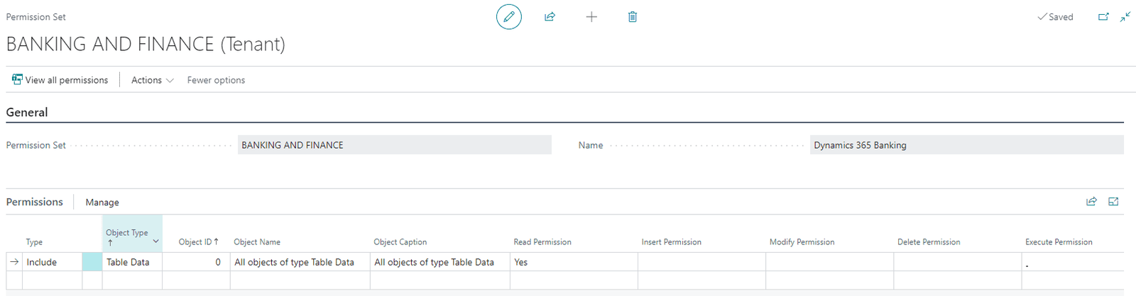 Here, we’ll select the “BANKING AND FINANCE” User-Defined Permission Set and click the “Permissions” button. The “Permission Set” window will appear: