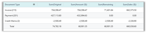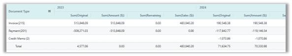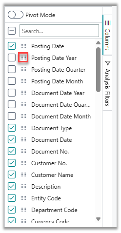 Any other non-numerical field, when selected, will become part of the Row Groups, or they can be dragged into the Column Labels section to name the columns. For example, drag the column “Posting Date Years” and BC will display the yearly totals.
