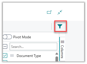 On each header, click the menu (represented by three parallel lines) and select the funnel icon. Select or enter the values to filter by.Regular List filters are also available by using the funnel icon on the upper right corner, which is the standard Business Central filters.