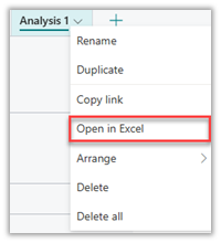 - Export to Excel: Once the Analysis View is ready and you are satisfied with the data you see on screen, click on the chevron next to the view and select Open in Excel.