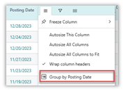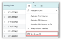 - Group or Ungroup Columns: On any header, select the menu icon and choose from two possible values:a. Group by [Field name] to add the field to the Rows Groupsb. Un-Group All: to ungroup all fields added to the Rows Groups.