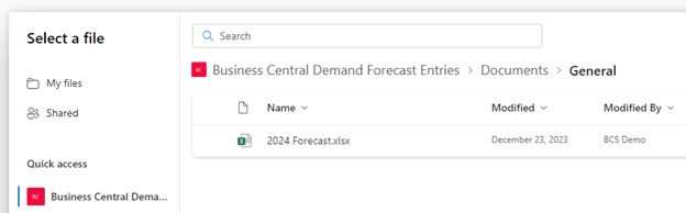 Next, browse to the saved “2024 Forecast” spreadsheet in the “Business Central Demand Forecast Entries” channel and click Import.